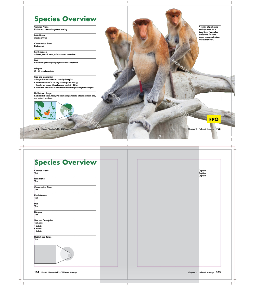 This is a concept reference book for young adults interested in primatology. It is named for its imagined author, Mr. Black. I designed and prototyped three spreads before building a template.